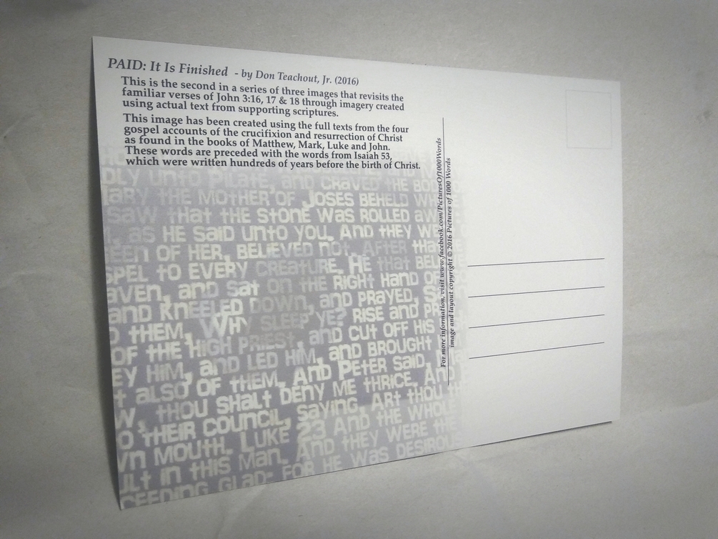 The central image of is available as a dual-purpose high-quality, highly detailed print. This image has been printed on 14 point card-stock for durability, and can be put in a frame or sent through the mail as a post-card. With the use of a magnifying glass, even the tiny text that the image has been created from is legible. This text begins with the 53rd chapter of Isaiah and includes all four accounts of the Crucifixion and Resurrection from the books of Matthew, Mark, Luke and John.