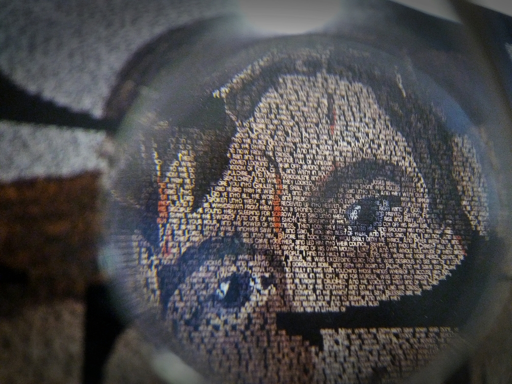 The central image of is available as a dual-purpose high-quality, highly detailed print. This image has been printed on 14 point card-stock for durability, and can be put in a frame or sent through the mail as a post-card. With the use of a magnifying glass, even the tiny text that the image has been created from is legible. This text begins with the 53rd chapter of Isaiah and includes all four accounts of the Crucifixion and Resurrection from the books of Matthew, Mark, Luke and John.